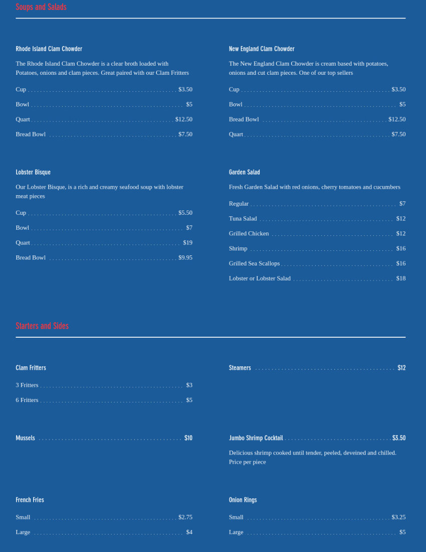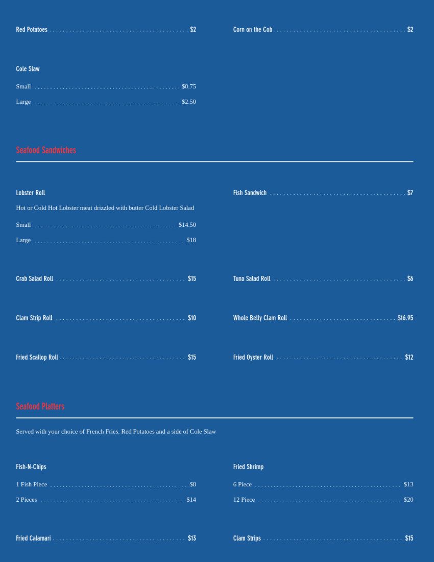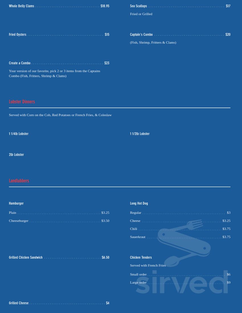 Seasonal outdoor restaurant on Shaw's Cove. Serving New England favorites such as Clam Chowder, Lobster Rolls, Fish-n-Chips, and Fried Clams.