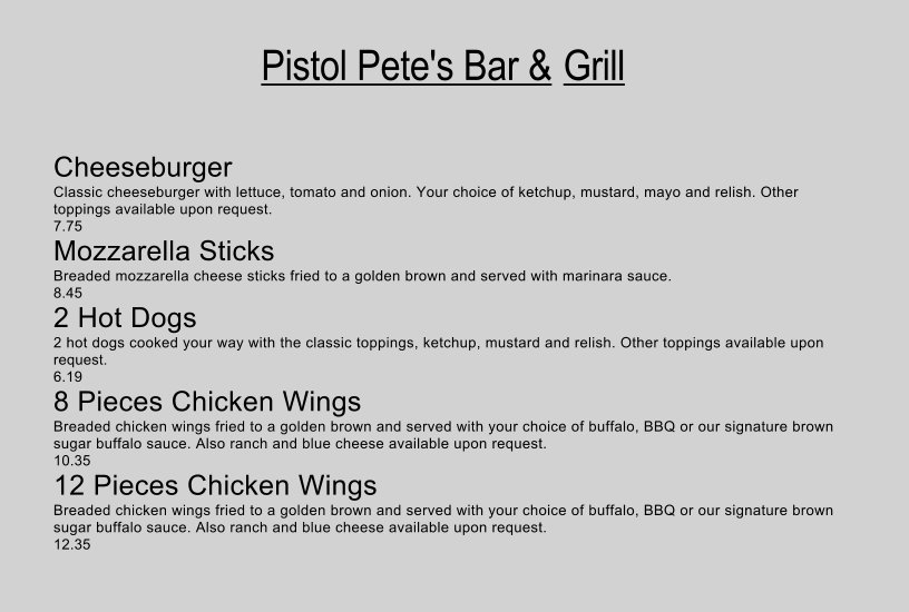 Stop in Pistol Pete's Bar & Grill Today and have a round with us. We have plenty of stuff to do here, we have 5 TV'S with the Main TV being 120' inch TV, 3 Pool Tables, 2 Mega Touch machines, a juke box you can play from your phone, Boxing Game, Big Buck World Hunting 2 Person Arcade Shooter, plus pour ever popular Beer Ball game where you win drink Prizes based on your score. Plus we have karaoke Thurs night & Sunday Night, and a DJ on Friday nights. And We have a Cash Pool tournaments every Friday. Stop in tonight because your missing out on the fun!!
