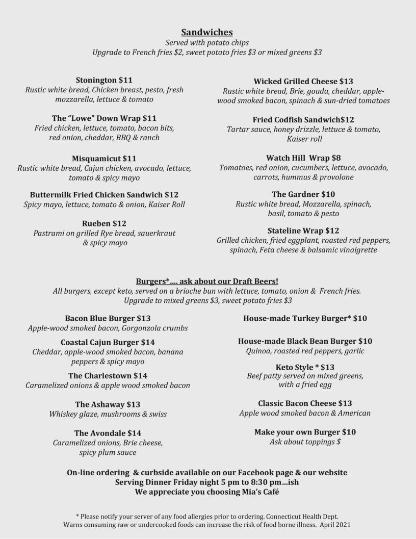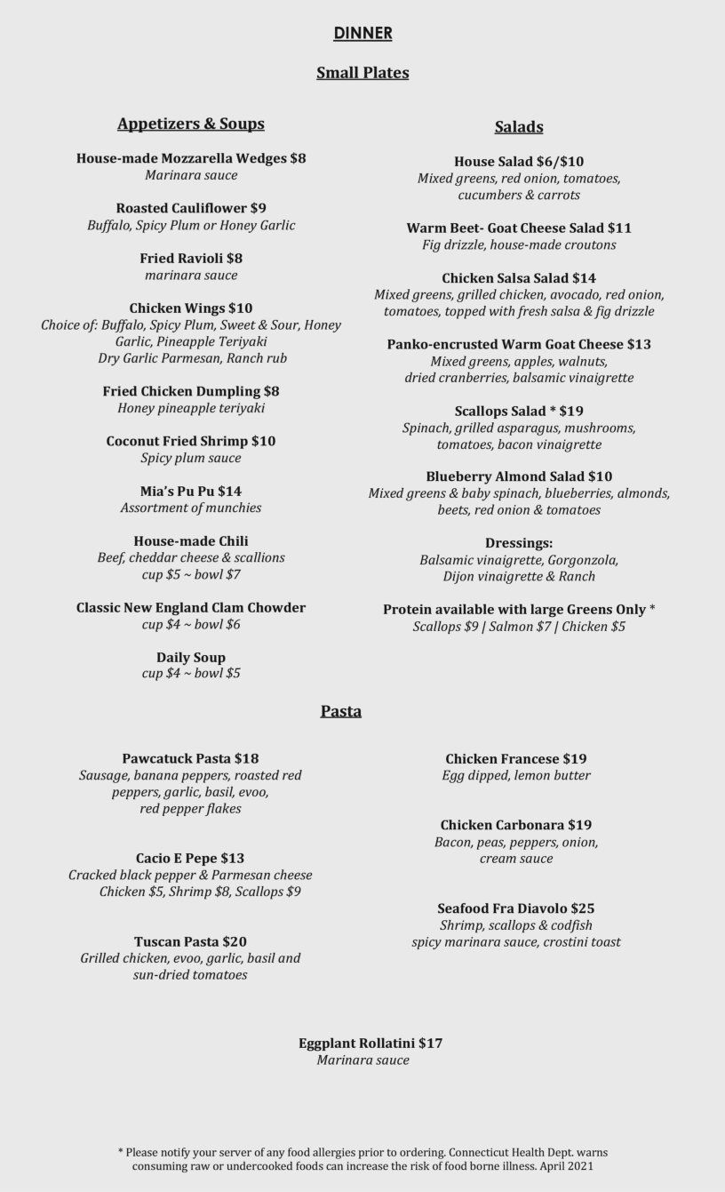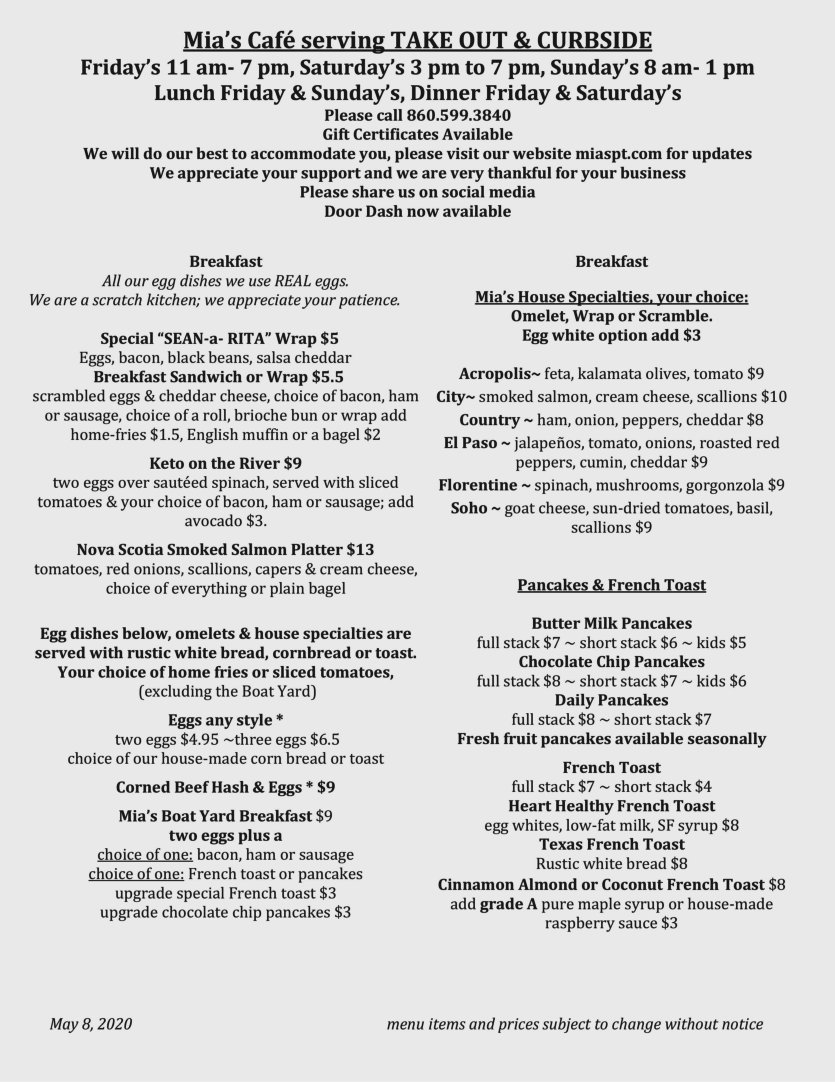 Mia's Cafe is located on the Pawcatuck river in the beautiful Downtown Westerly-Pawcatuck Community. Its where locals love to hang out! Our feel is instantly welcoming! A fun atmosphere where you will enjoy your meal with a water view. We're passionate about cooking with local, seasonal ingredients and love how they can inspire new dishes.