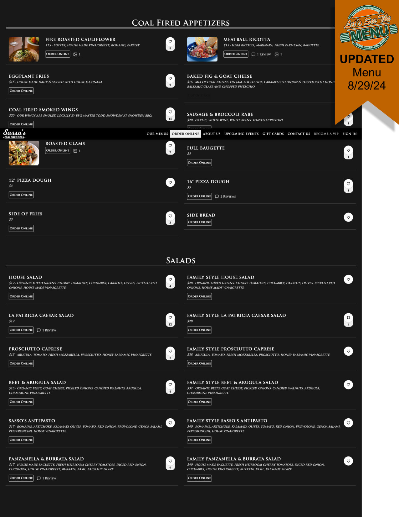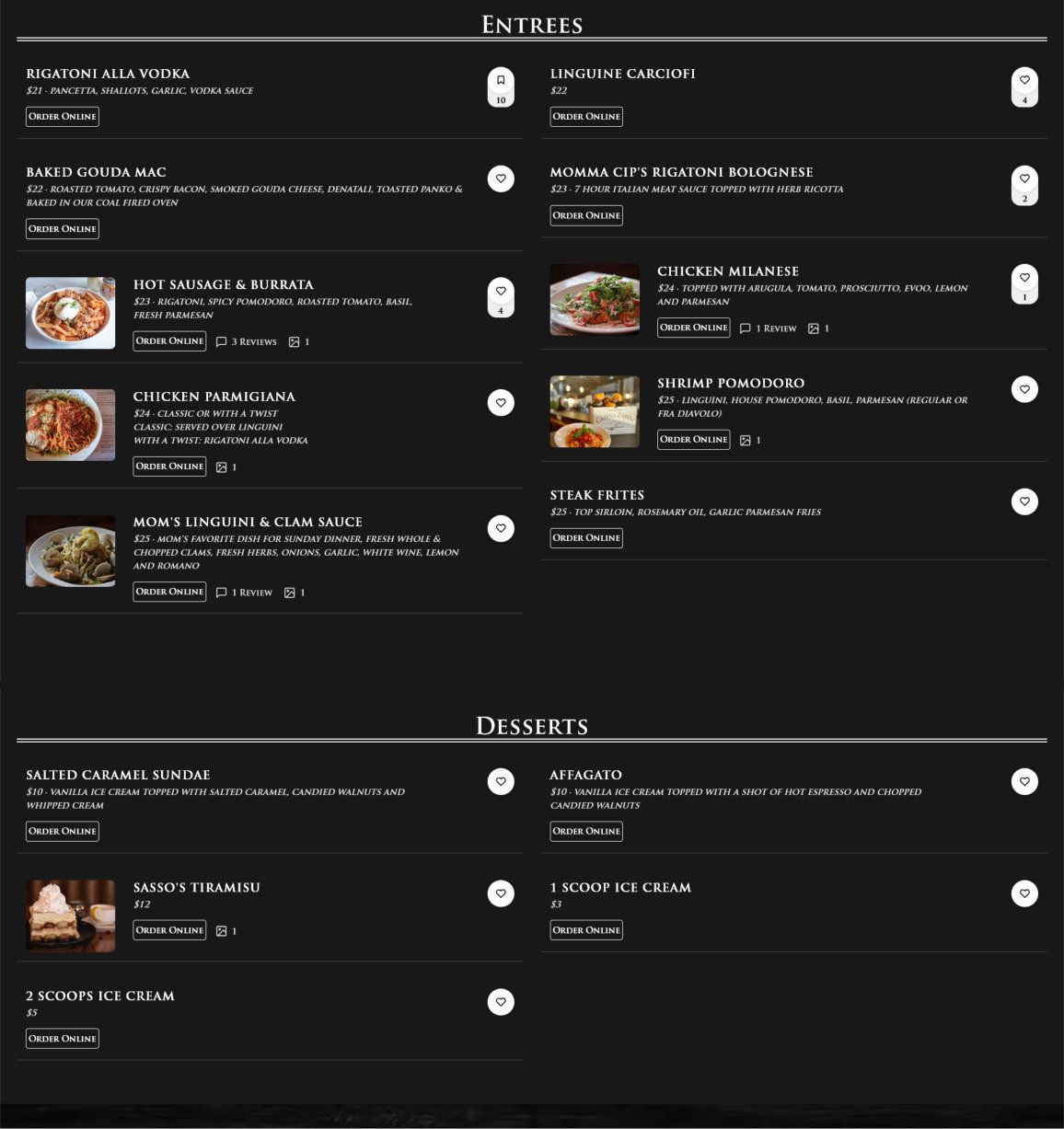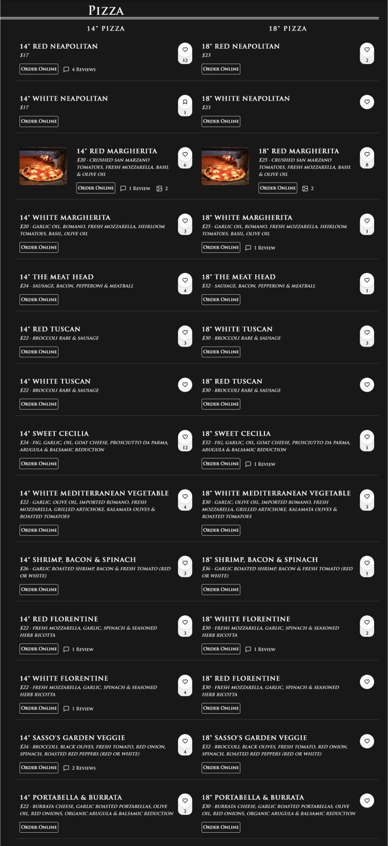 We're known for our New Haven-style, thin-crust pizza; our gourmet pizzas cook in our coal-fired oven, giving it that charred look & delicious crunchy taste. We also offer a craft cocktail, beer, & wine menu. Come enjoy a fun night with friends @ SASSO'S