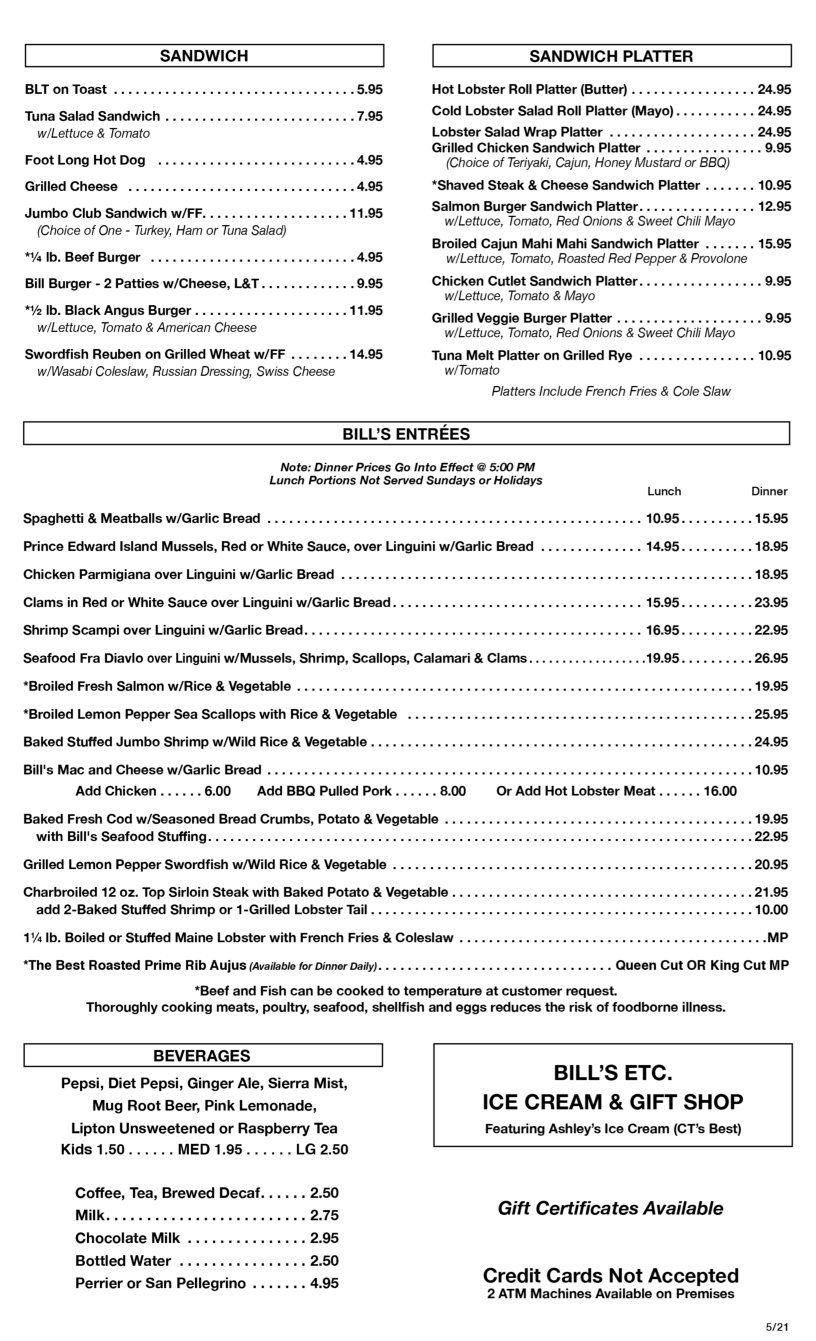 Bill's Seafood is familiar territory to boaters who dock their boats in some the finest marinas on the East Coast in Westbrook Connecticut. Outside picnic tables on the edge of the Patchogue River, and a center bar/dining room with a nautical kind atmosphere is the best on going party on the East Coast. When thinking of scrod, swordfish, tuna, big sweet lobsters, cherrystone clams and fried clams or our popular specials, Bill's Seafood is the place to bring your family and relax. As the Seasons change so do we.