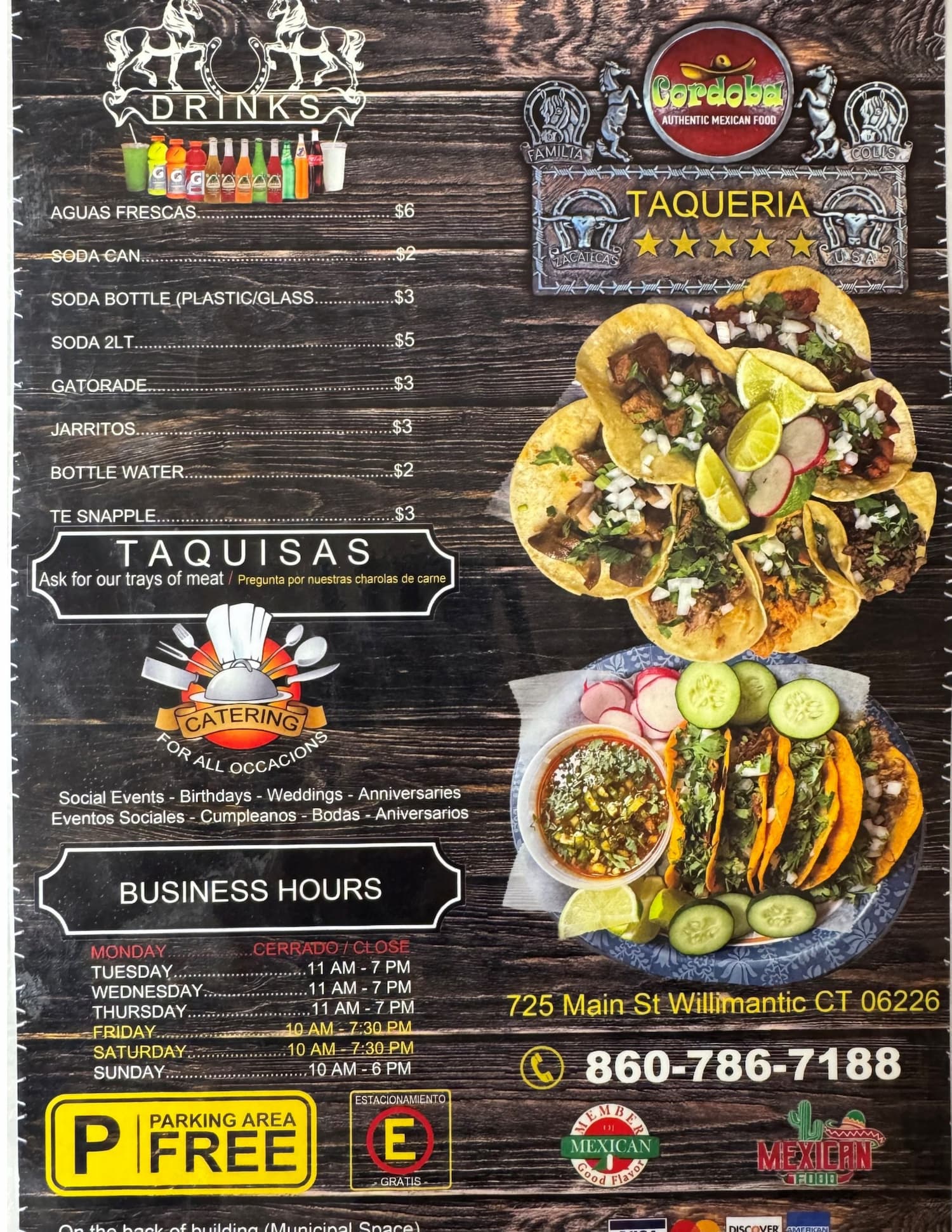 Mexican Food, Restaurants near me, Mexican Restaurants near me, Taqueria Cordoba, Food near me, Mexican Food, Fast Food, Willimantic, Taqueria Cordoba Willimantic, Menudo, Tortas, Tacos, Burritos, Sopes, Quesadillas, Carne Asadas, Huaraches